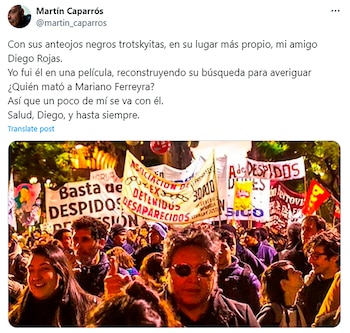 “Con sus anteojos negros trotskyitas, en su lugar más propio, mi amigo Diego Rojas. Yo fui él en una película, reconstruyendo su búsqueda para averiguar ¿Quién mató a Mariano Ferreyra? Así que un poco de mí se va con él. Salud, Diego, y hasta siempre”.