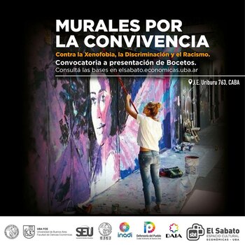 El Sabato Espacio Cultural de Económicas UBA abrió la convocatoria y bases para la presentación de bocetos para la campaña "Murales por la convivencia: contra la xenofobia, la discriminación y el racismo" que organiza, junto a la Delegación de Asociaciones Israelitas Argentinas, (DAIA), el Instituto Nacional contra la Discriminación, la Xenofobia y el Racismo (INADI) y la Defensoría del Pueblo de la Ciudad Autónoma de Buenos Aires.