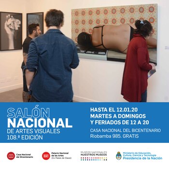 La Casa Nacional del Bicentenario exhibe las obras seleccionadas y premiadas en la 108° edición del Salón Nacional de Artes Visuales. Curada por Nancy Rojas, la exposición reúne más de 180 piezas, distribuidas en cinco niveles, que ofrecen un panorama de la escena artística argentina contemporánea.