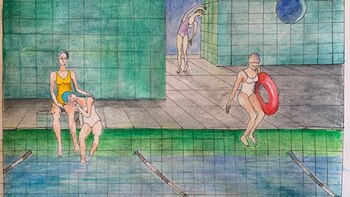 El puente entre estos dos mundos lo tienden las tres esculturas pequeñas -una de un solitario oso polar y dos de las nadadoras- realizadas por Schussheim. Acompaña la experiencia un video en continuo, en cámara lenta, de una ola gigante a punto de romper. La banda sonora de la sala y del video es de Damián Laplace.