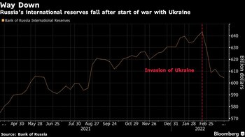 Russland verfügte zum 25. März über Devisen- und Goldreserven von rund 604 Milliarden US-Dollar. Dies ist jedoch der niedrigste Stand seit August und liegt um 38,8 Milliarden US-Dollar unter dem Februar-Hoch, was die Entwässerung seit Beginn der Invasion in Russland unterstreicht.