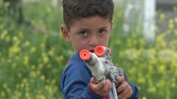 Aunque en las imágenes difundidas se lo puede observar vestido del Barcelona con la '10' del argentino y jugando con una pelota junto a su papá; el hombre esboza que la principal diversión de su hijo ahora es jugar con una ametralladora de juguete, imitando a quienes fueron sus captores.