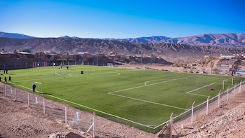 Causa impacto el contraste del verde pasto artificial con el paisaje de la Quebrada de Humahuaca, punto neurálgico de la provincia de Jujuy. Esta es la cancha de sintético de mayor altura del país.