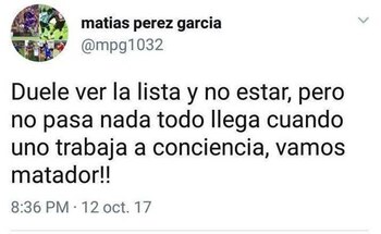 "Duele ver la lista y no estar. Pero no pasa nada, todo llega cuando uno trabaja a conciencia. Vamos Matador!", subió el futbolista de 33 años en la red social por intermedio de su cuenta.