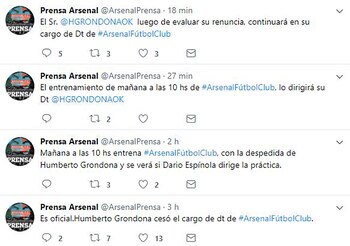 En menos de 24 horas desde el empate sin goles ante Tigre que lo mantuvo en el fondo de la tabla, Humberto Grondona renunció a su cargo de entrenador pero se arrepintió y comunicó que seguirá al frente del plantel de Arsenal. Todo en vivo y en directo, por TV.