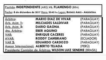 "El Rojo" -que eliminó a Libertad de Paraguay en la semifinal- será local en la primera final, que se disputará el miércoles 6 de diciembre a las 20.45 en el estadio Libertadores de América, en Avellaneda. El árbitro del encuentro será el paraguayo Mario Díaz de Vivar.