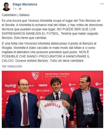 "Es una locura que Montella ocupe el lugar del Toto Berizzo en el Sevilla. A Montella lo echaron mal del Milan, y hay miles de directores técnicos que pueden ocupar ese lugar. NO PUEDE SER QUE LOS EMPRESARIOS MANEJEN EL FÚTBOL. Tendría que haber seguido Berizzo. Esto tiene que cambiar", sentenció el Diez en su cuenta de Facebook.