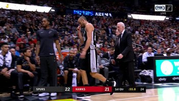 El bahiense apenas pudo estar en cancha cuatro minutos, antes de sufrir un golpe en un bloqueo con su ex compañero Dewayne Dedmon. En las imágenes se ve cómo Ginóbili quiso seguir jugando pese a la molestia en su muslo pero segundos más tarde realizó señas al banco y se retiró directamente a los vestuarios.