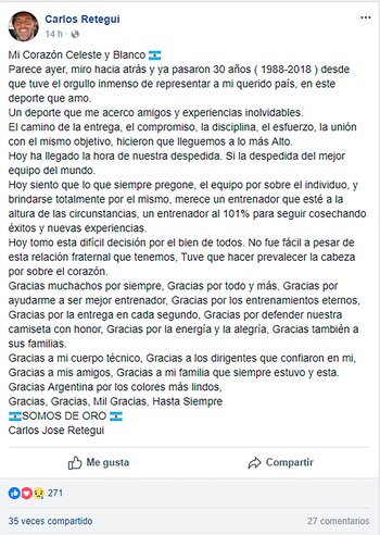 "Ha llegado la hora de nuestra despedida. Sí, la despedida del mejor equipo del mundo. Hoy siento que lo que siempre pregoné, el equipo por sobre el individuo y brindarse totalmente por el mismo, merece un entrenador que esté a la altura de las circunstancias, un entrenador al 101% para seguir cosechando éxitos y nuevas experiencias", escribió el técnico de 48 años en su cuenta personal de Facebook.