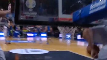 El argentino Marcos Delía se dirigió al aro y volcó la pelota para que el equipo de Sergio Hernández pase al frente en el marcador por 8-4. En ese momento, el guaraní Alejandro Peralta fue en búsqueda del esférico para reiniciar el partido y la estructura se vino abajo en el estadio de Olavarría.