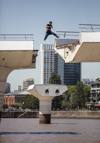 El máximo referente mundial del parkour, Dimitris Kyrsanidis, estuvo en Buenos Aires para filmar el cortometraje Running late. En este divertido proyecto, el atleta internacional demostró cómo va desde el Monumental hacia la Bombera, con un recorrido lleno de obstáculos y desafíos que sortea con su increíble habilidad corporal.