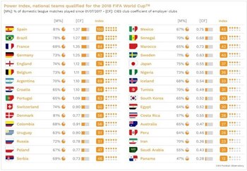 Para confeccionar la nómina, el CIES empleó lo que el Centro mismo definió como "índice de poder". Este índice combina el porcentaje medio de partidos de campeonato disputados desde el 1 de julio de 2017 por los 23 jugadores más utilizados por cada selección durante la campaña de clasificación, con el nivel deportivo medio de los clubes que los emplean.