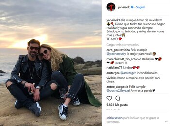 "¡Feliz cumple Amor de mi vida! Deseo que todos tus sueños se hagan realidad y sigas sonriendo siempre. Brindo por tu felicidad y miles de aventuras más juntos. Te amo", escribió la novia del Pocho en su cuenta de Instagram, en compañía de una foto de los dos con el mar y el atardecer de fondo.