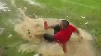 En las imágenes se puede observar como, en el momento en el que la pelota ingresa al fondo de la red, Cardetti gritó desaforado e improvisó un corto baile con su ayudante para luego zambullirse en un charco de agua al costado del campo de juego.