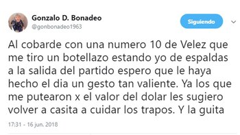 "Al cobarde con una número 10 de Vélez que me tiró un botellazo estando yo de espaldas a la salida del partido espero que le haya hecho el dia un gesto tan valiente", publicó en su cuenta personal de Twitter.