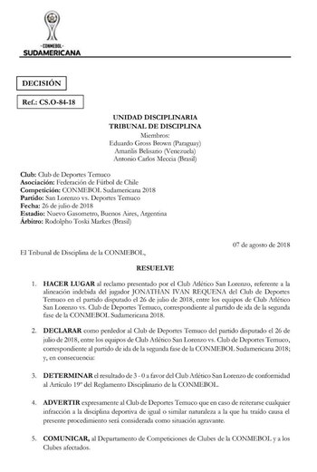 En el fallo, firmado por Eduardo Gross Brown (Paraguay), Amarilis Belisario (Venezuela) y Antonio Meccia (Brasil), integrantes del Tribunal de Disciplina de Conmebol, Temuco fue advertido: "en caso de reiterarse cualquier infracción a la disciplina deportiva de igual o similar naturaleza a la que ha traído causa el presente procedimiento será considerada como situación agravante".