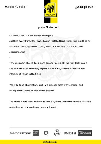 Nawalf Al Maqairen, presidente del club, fue el que firmó la comunicación, en la que aseguró que "como todos los fanáticos del Al Ittihad, deseaba que la Supercopa de Arabia Saudita fuera el primer título de una larga temporada". Y aseguró que "el partido fue una lección para nosotros. Vamos a analizar todos los aspectos para el futuro de Al Ittihad. Sí, haré observaciones y las discutiré con el cuerpo técnico y los jugadores".