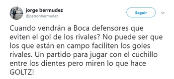 "Un partido para jugar con el cuchillo entre los dientes, ¡pero miren lo que hace GOLTZ!", escribió el ex futbolista colombiano en su cuenta de Twitter sobre el accionar del ex Lanús, Huracán y América de México.