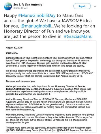 La segunda propuesta que le llegó a través de las redes sociales tampoco tenía relación alguna con el deporte. Sea Life Aquarium y Leoland Discovery Center de San Antonio, que será inaugurado en 2019 en la ciudad, le ofreció transformarse en el nuevo "Director Honorario de la diversión", tal vez basándose en su tendencia al "showtime" cuando hacía maravillas con la pelota naranja. El ofrecimiento es formal: lleva la firma de Jeremy Aguillen, manager del emprendimiento.