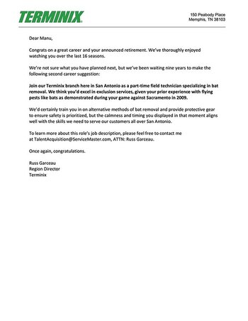 Pues bien, la empresa Terminix, dedicada al control de plagas en Estados Unidos, le ofreció incorporarse al staff part time para dedicarse al exterminio de murciélagos. "La calma y precisión que mostraste en ese momento tienen relación con las capacidades que necesitamos para servir a nuestros clientes", dice un párrafo de la carta que rubrica Russ Garceau, director en la región de la firma.