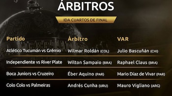 En lo que respecta a los árbitros, la designación fue de la siguiente manera: Wilton Sampaio de Brasil dirigirá Independiente-River en Avellaneda, Éber Aquino de Paraguay estará en Boca-Cruzeiro en La Bombonera, Wilmar Roldán de Colombia lo hará en Atlético Tucumán-Gremio y Andrés Cunha de Uruguay impartirá justicia en Colo Colo-Palmeiras.