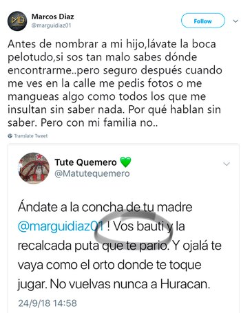 "Antes de nombrar a mi hijo, lavate la boca pelotudo, si sos tan malo sabes dónde encontrarme.. pero seguro después cuando me ves en la calle me pedis fotos o me mangueas algo como todos los que me insultan sin saber nada. Por qué hablan sin saber. Pero con mi familia no..", fue la respuesta de Marcos Díaz.