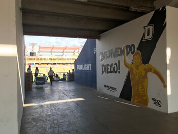 Un mural enorme ubicado en la entrada principal de la platea baja enseña a un joven de rulos con su puño levantado. Toda su figura está teñida de dorado y una frase en negro, igual de grande, ocupa por completo la pared de cemento: "Bienvenido Diego".