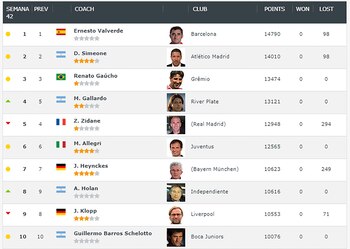 Además, Marcelo Gallardo se afirma como el mejor entrenador de América y cuarto en todo el planeta. El "Muñeco" es superado por el español Ernesto Valverde (Barcelona), su compatriota Diego Simeone (Atlético de Madrid) y el brasileño Renato Gaúcho (Gremio de Brasil).