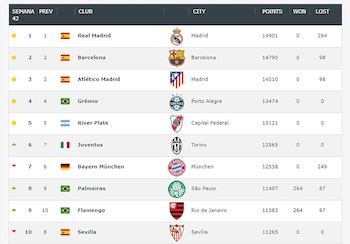 Según el ranking elaborado por el sitio Football World Ranking, River es el quinto mejor equipo del mundo y figura detrás de los españoles Real Madrid, Barcelona y Atlético de Madrid y del Gremio de Brasil, justamente su rival en la Copa Libertadores.