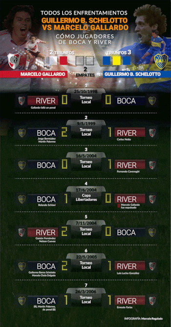 4• 17/6/2004 Copa Libertadores: Boca 1 River 0. Gol: Rolando Schiavi. Nota: Marcelo Gallardo fue expulsado.