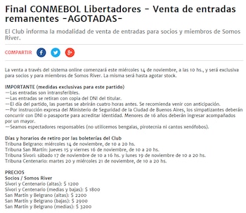 La última instancia fue una venta de localidades remanentes, que se llevó a cabo de manera online a partir de esta mañana. Fue exclusiva para socios y miembros de Somos River (los precios oscilaron entre los 1.200 pesos y los 3.200 pesos.