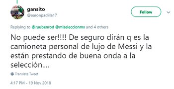 El que hizo pública la perla fue el periodista Rubén Rodríguez a través de su cuenta de Twitter: filmó la camioneta que le fue designada al seleccionado azteca para trasladar su utilería. Y, por lo que se puede observar, se trata de un vehículo destartalado, inapropiado para un evento de esta envergadura. "Asi las cosas para la selección de México en Argentina… Imagínense si fuera al revés… y esta calidad se le brindará en México a la AFA", escribió en su cuenta, acompañando el video.