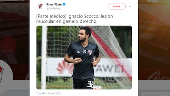 El entrenamiento de River tuvo hoy una noticia inesperada: cuando Ignacio Scocco intensificó los movimientos en la práctica del plantel en Ezeiza, se resintió de los dolores en el gemelo derecho donde se lesionó hace 18 días, en el partido que el Millonario perdió con Estudiantes por la Superliga, y no estará el sábado ante Boca en la definición de la Copa Libertadores.