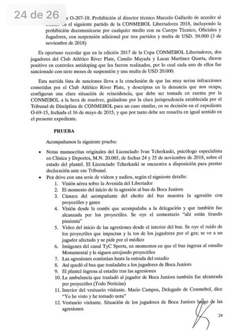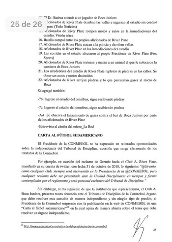 En las hojas que se viralizaron en las redes sociales se destacaron 22 menciones con "pruebas" sobre la agresión sufrida por el contingente de Boca en la previa al compromiso que se iba a disputar el pasado sábado 24 de noviembre en el estadio Monumental (y por consiguiente el domingo 25). Y también se redactó una carta que hace hincapié en la independencia del Tribunal Disciplinario en esta cuestión.
