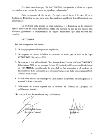 Se filtraron algunas hojas del comunicado que Boca le presentó a la Conmebol con la firma de Daniel Angelici (presidente) y Christian Gribaudo (secretario general), en el que exige la suspensión de la segunda final de la Copa Libertadores, la descalificación de River Plate y su proclamación como campeón. Fueron un total de 46 fojas, según detalló Daniel Angelici tras la reunión.