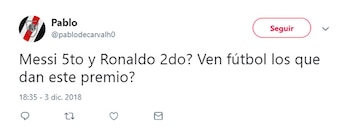 No fue el único foco de reclamos hacia el galardón que organiza la revista France Football. Griezmann también elevó la voz porque, si bien quedó en el tercer lugar de la elección, ningún jugador francés obtuvo un premio al mejor jugador del 2018 en el año en el que el combinado galo ganó el Mundial de Rusia.