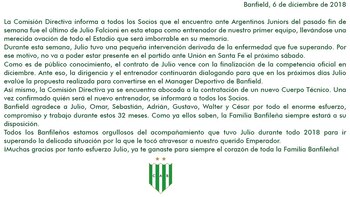 Luego de 32 meses, Banfield oficializó la salida de Julio César Falcioni como entrenador. El elenco del Sur confirmó que el vínculo del "Emperador" no será renovado y que están a la espera de una respuesta al ofrecimiento para que sea manager deportivo del club.