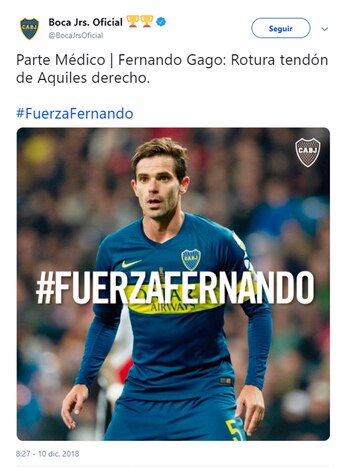"Pintita" se retiró lesionado en la segunda parte de la prorroga de la final de la Copa Libertadores y dejó a su equipo con nueve jugadores en los minutos finales del partido. La cuenta de Twitter de Boca Juniors publicó el parte médico oficial: "Rotura tendón de Aquiles derecho".