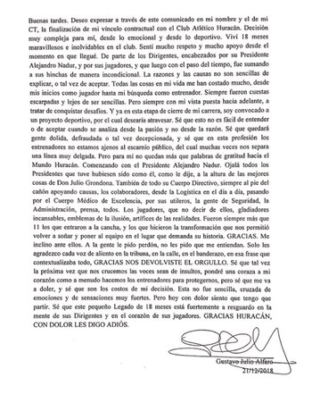 El director técnico de Huracán, Gustavo Alfaro, se despidió formalmente de los jugadores, de los dirigentes y de los hinchas a través de una carta y confirmó que será el reemplazo de Guillermo Barros Schelotto en el banco de Boca.