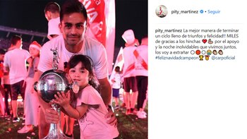 Tras su noche soñada en la celebración en el Monumental por la obtención de la Copa Libertadores, Martínez eligió su cuenta de Instagram para compartir el mensaje y una foto junto a su hija Pilar, a quien le dedica sus goles dibujando una P con sus dedos al aire, y el preciado trofeo, para el último adiós.