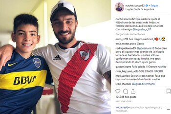En la imagen, el futbolista viste la camiseta de River y el joven, la de Boca. Ambos están abrazados y sonrientes.