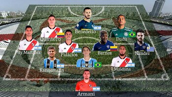 La nómina fue escogida por 320 periodistas de todo el continente. El equipo quedó conformado por Franco Armani; Jonathan Maidana, Geromel (Gremio), Walter Kannemann (Gremio); Nahitan Nandez, Wilmar Barrios, Exequiel Palacios, Gonzalo Martínez; Dudú (Palmeiras), Juanfer Quintero; y Darío Benedetto.