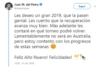 "Les deseo un gran 2019, que la pasen genial. Les cuento que la recuperación avanza muy bien. Más adelante les contaré en qué torneo podré volver. Lamentablemente no será en Australia, pero estoy contento con los progresos de estas semanas. Feliz Año Nuevo! Felicidades!", escribió Del Potro.