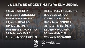Del 10 al 27 de enero, en Alemania y Dinamarca, se llevará adelante la XXVI edición del Mundial masculino de handball. Los Gladiadores, que desde Japón 1997 participan de manera ininterrumpida en este torneo, arriban diezmados por las sensibles bajas de Diego Simonet (la temporada pasada fue campeón de la Champions League y nombrado MVP en la final), Federico Pizarro y Pablo Vainstein.