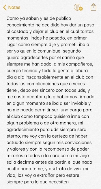 "Quiero agradecer por el cariño que siempre me han dado, a mis compañeros, cuerpo técnico y toda la gente que labura incansablemente en el club con todas las complicaciones que a veces tiene", destacó el goleador en uno de los párrafos.