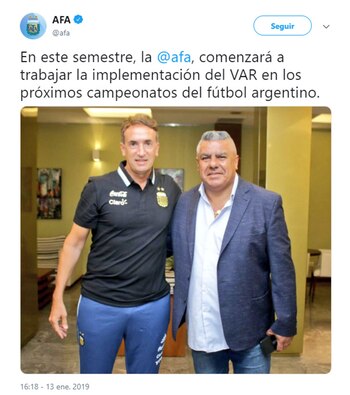 "En este semestre, la AFA comenzará a trabajar la implementación del VAR en los próximos campeonatos del fútbol argentino", anunció la entidad de la calle Viamonte a través de un mensaje en Twitter junto a una foto del presidente Claudio "Chiqui" Tapia y Federico Beligoy, Director Nacional de Árbitros.