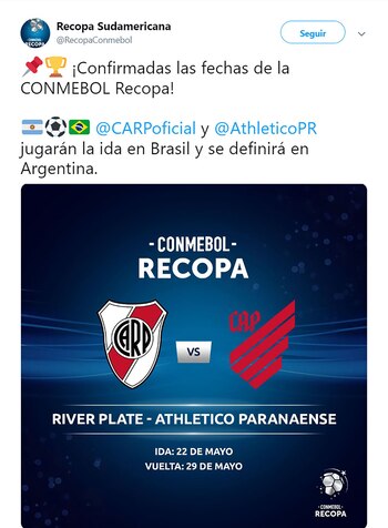 En la reunión de Consejo de la Conmebol, que se llevó a cabo en Río de Janeiro, sede del sorteo de la Copa América, quedaron definidas las fechas de disputa de la Recopa Sudamericana, cetro por el que se medirán River Plate (campeón de la Copa Libertadores) y Atlético Paranaense (vencedor de la Sudamericana).