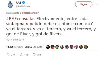 El segundo corresponde a un usuario de Twitter que le hizo una consulta a la Real Academia Española. "¿Cómo están? Quisiera saber si la frase "Y va el tercero y va el tercero y va el tercero y gol de River y gol de River" no quedaría mejor separada por comas", escribió Juan Casasbuenas. Recibió una respuesta oficial por parte de la institución que regula el lenguaje hispano que no tardó un difundirse: "Efectivamente, entre cada sintagma repetido debe escribirse coma: «Y va el tercero, y va el tercero, y va el tercero, y gol de River, y gol de River»".