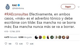 Sin embargo, luego de notar las intenciones del simpatizante del Millonario, esta tarde la RAE explicó una duda gramatical con un ejemplo que fue un guiño para los hinchas del Xeneize. "RAE Consultas: efectivamente, en ambos casos, «más» es el adverbio tónico y debe escribirse con tilde: Esa mancha no se borra más; Esa mancha nunca más se va a borrar", se despachó.