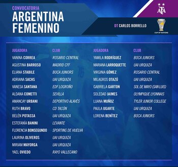 Las novedades respecto de las jugadoras que integraron el plantel que superó a Panamá en noviembre pasado son las inclusiones de la defensora Luana Muñoz (de Texas Tech de Estados Unidos, que fue baja por lesión ante las centroamericanas), de la mediocampista Lorena Benítez (Boca Juniors) y de la delantera Paula Ugarte (UAI Urquiza).